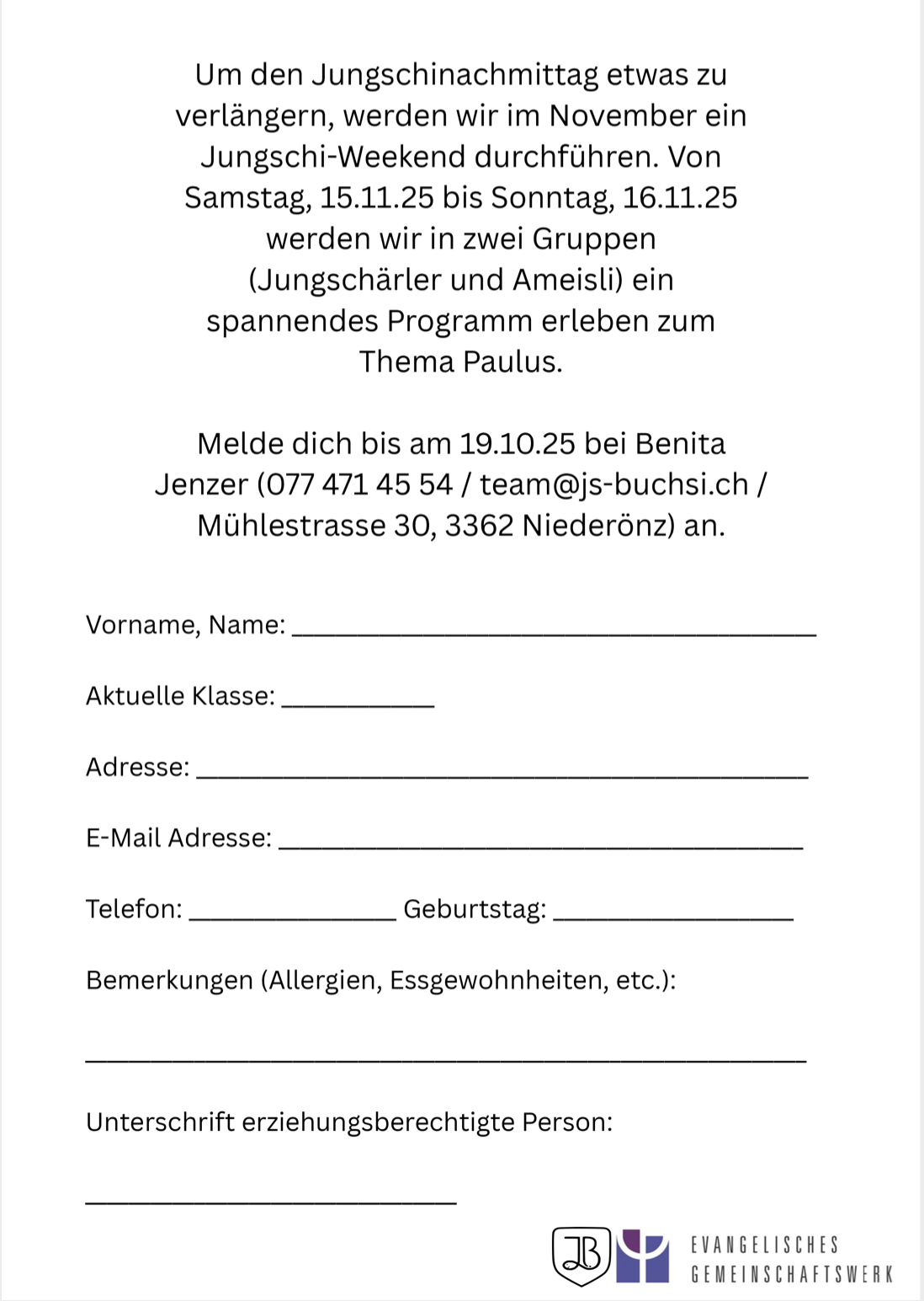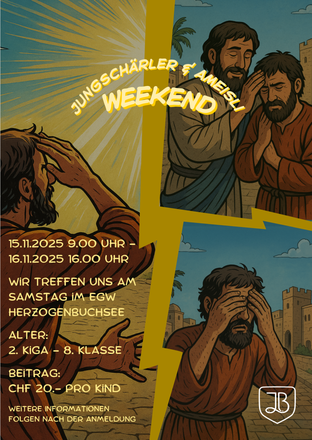 Wir starten am 15. November um 9:00 Uhr und erleben ein spannendes Programm bis am 16. November um 16:00 Uhr. Weitere Infos zum Wochenende und der Anmeldung findet ihr auf dem Flyer. Wir freuen uns auf euch! 🤩